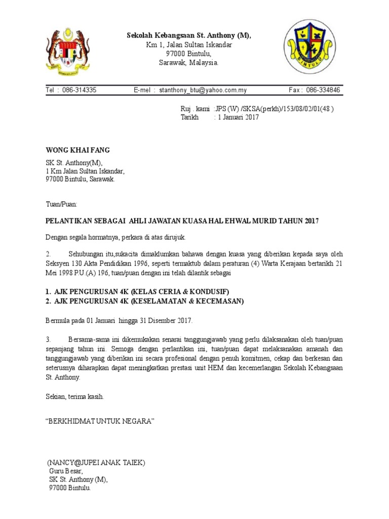 Related : Contoh Surat Lantikan Jawatan - Surat Lantikan Urusetia Kem Cemerlang Jawi Perdana Peringkat Kebangsaan - Jangan sampai dokumenmu ditolak karena salah buat!.